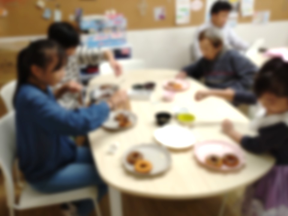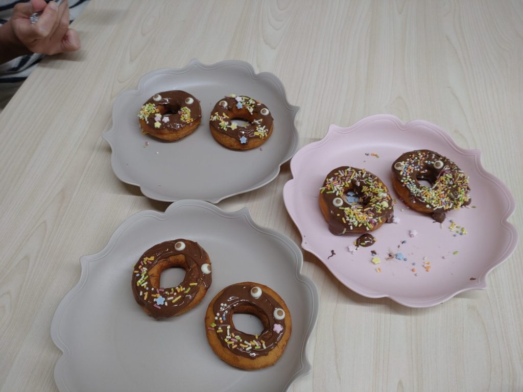 交流会では、ハロウインドーナッツを作って食べました どれも美味しい!といっぱい食べました
