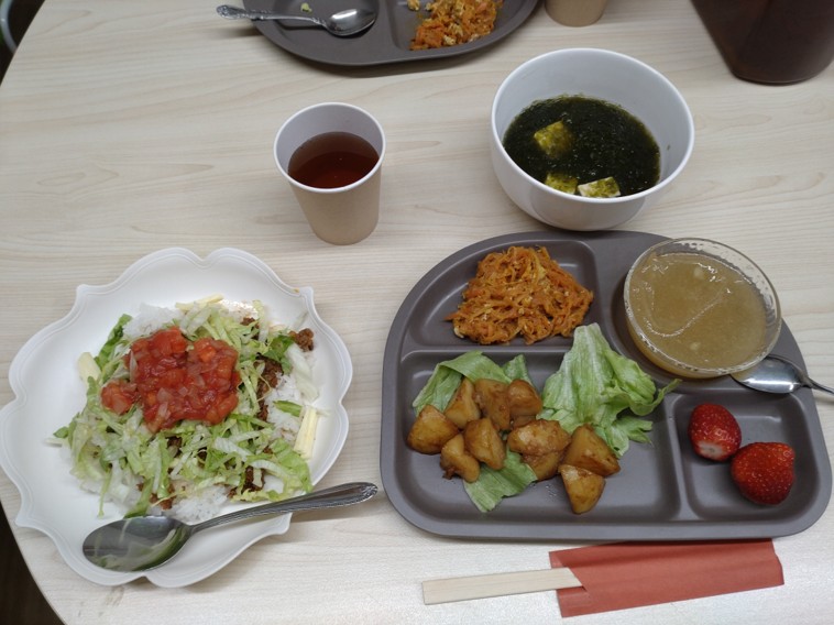 メニュー:タコライス、にんじんしりしり、ジャガイモのオイマヨコロコロ、あおさ汁、りんごゼリー