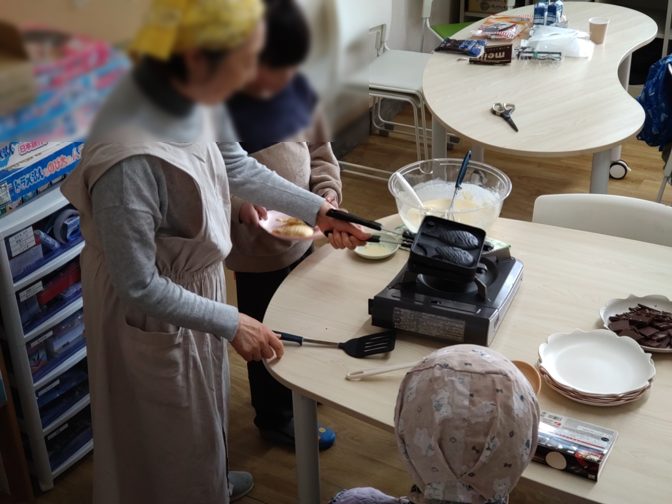 食後の交流会では、あんこたっぷりのたいやきを作りました。